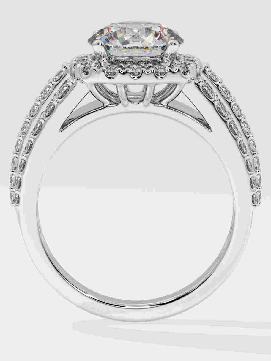 Introducing the Bedazzle Cushion Halo Ring, an epitome of radiant luxury and timeless elegance. At its core, a mesmerizing 1.5 ct round brilliant center diamond, embraced by a luxurious cushion halo, emanating an unparalleled beam of light. Complemented by a triple row diamond-studded shank, this masterpiece is a dazzling showcase of opulence and refinement. Own the spotlight and exude unmatched brilliance with this stunner, crafted for those who appreciate the exquisite beauty of pure diamonds. Elevate your ensemble to extraordinary heights with the Bedazzle Cushion Halo Ring, a true symbol of sophistication and prestige in luxury jewelry.